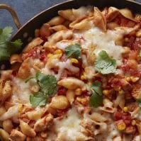 Add extra oil if the skillet if needed. Add onion and garlic, cook for 90 seconds until starting to soften. Add bell pepper and cook for another 2 minutes. Add the canned tomatoes, corn, enchilada sauce and bring to boil and reduce to a simmer for cook down for 15 minutes. Once simmering, add the pasta and chicken and stir to combine.