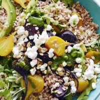 Combine the arugula, beet wedges, farro, shaved fennel, avocado and goat cheese on a large serving platter and drizzle with basil vinaigrette. Sprinkle the pepitas on top and serve immediately.