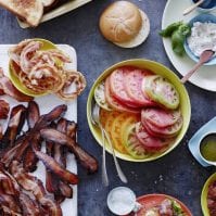 Add shallots and garlic to pan and cook over medium heat, stirring, until translucent, about 5 minutes. Add chili powder and mustard and cook, stirring, 1 minute. Increase heat to high; add bourbon and maple syrup. Bring to a boil, scraping up browned bits. Add vinegar and brown sugar and return to a boil. Add reserved bacon; reduce heat to low. Simmer, stirring occasionally, until liquid reduces to a thick glaze, about 10 minutes.