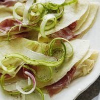 Fill each crepe with the prosciutto and cheese. Fold the crepe in half and then half again. Transfer the finished crepe to a baking sheet. Once all the crepes are stuffed, transfer to a 350 degree oven and warm for 3 minutes until the cheese has melted.