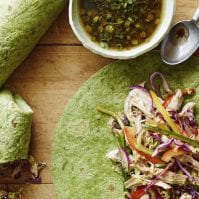 Arrange the 4 large spinach tortilla wraps on a clean surface. Spoon equal amounts of the cabbage chicken mixture in the middle of each wrap and wrap (like chipotle) to seal. Cut in half and serve immediately.