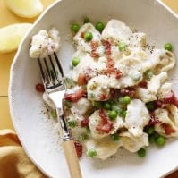 Add the butter to the same skillet over medium high heat. Add the garlic and sauté for 30-45 seconds before adding the flour and stirring to combine. Gradually whisk in the milk and bring the mixture to a boil. Once the sauce thickens, season with salt and pepper and stir the tortellini, peas and the grated cheese into the sauce, stir to combine. Add half of the cooked pancetta back into the sauce.