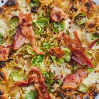 Top each pizza with half of the shredded cheese, fresh mozzarella, sautéed leeks and sliced brussels sprouts. Transfer the pizzas into the oven and bake for 12-13 minutes until the crust is perfect.