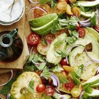 Slice the tomatoes in thick pieces and cut the cherry tomatoes into halves. Arrange on a large platter or in a bowl and add the red onion and avocado along with the herbs on top.