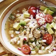 Using 2 forks, shred the chicken into small pieces. Add the chicken and drained hominy to the Dutch oven. Raise the heat to medium to warm everything through. Taste and add more salt or other seasonings if needed. Discard the bay leaf.