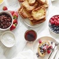 Arrange the homemade french toast on a large serving platter and scatter the toppings around. Serve immediately and let your friends and family create their own perfect french toast.