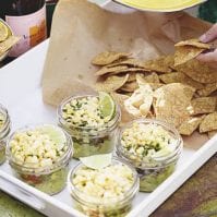 Place equal amounts of the guacamole in the bottom of 10 small mason jars. Next, layer on equal amounts of pico and top with the corn kernels. Add a wedge of lime and season with salt and pepper. Serve with tortilla chips.