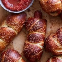 In the meantime, turn the dough out onto a slightly oiled work surface and divide into 10 equal pieces. Roll into ropes, and then roll the rope around an entire hot dog, making sure to secure the ends.