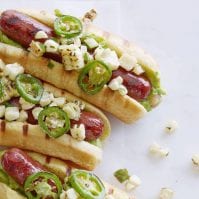 Place a few spoonfuls of guacamole in the toasted bun, followed by the Ball Park Park’s Finest frank, and top with the corn relish and charred jalapeno slices. Serve.