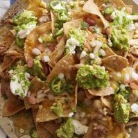 Arrange the chips on a large sheet pan. Evenly distribute the cheese, refried beans, corn and chicken making sure each chip is coated with some cheese and equal parts of all the toppings. Transfer the sheet pan on the grill and cover. Let the cheese melt. Once the cheese has melted, remove the sheet pan carefully and add little spoonfuls of the garnishes on top. Serve immediately.