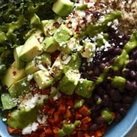 Toss the kale, olive oil, lime juice and salt in a large bowl and then divide into 4 bowls. In each bowl, add small groupings of the avocados, quinoa, black beans, cotija and sweet potatoes.