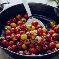 Add the cherry tomatoes and let sit for 2 minutes until they start to blister. Give them a quick stir, turn off the heat, and let them sit for another 2 minutes or so. Season with salt and pepper and sprinkle with a few tablespoons of torn basil and parsley.