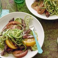 Slice the flank steak against the grain and place on top of the zucchini noodles. Serve immediately. Cut the heirloom tomatoes into wedges and nestle into the dish.