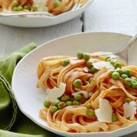 Cook the pasta according to the package directions. 1 minute before it’s done, add the peas. Drain the pasta and peas and set aside.