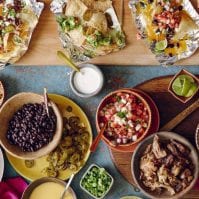 Place a layer of chips on a tin foil sheet. Layer with shredded cheese, cheese sauce and various toppings and transfer to the oven to let the cheese melt.