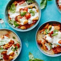 Transfer the gnocchi and sauce to an oven-proof dish and top with the torn mozzarella.