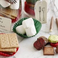 Layer the ingredients for the s’more kit in a glass mason jar. Include various types of graham crackers, different chocolate and plenty of marshmallows. Tie each jar up with a string and give as gifts!