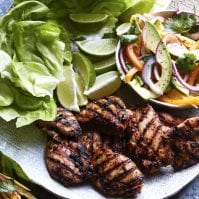 Assemble the lettuce cups with a piece of chicken, a few tablespoons of the topping and serve with extra limes if needed.