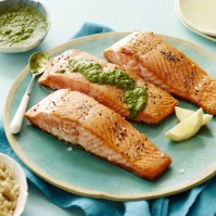 Transfer the salmon filets to the hot skillet, skin side down. Cook the filets for 4-5 minutes on each side, until just lightly pink in the center. Serve immediately over a bed of rice and top with the basil pesto vinaigrette.