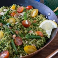 In a large bowl, toss together cooked freekeh, asparagus mixture and 1/2 cup of the pesto. Taste and adjust salt and pepper as needed. Add more pesto if desired, cherry tomatoes and serve warm or at room temperature. Garnish with chopped whole almonds.