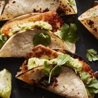 Line half of each tortilla with guacamole. Top with fried halloumi. Sprinkle of cilantro. Serve with lemon and lime wedges.