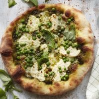 Spread the basil vinaigrette on one side of the pizza, followed by the mozzarella, small dollops of ricotta and fresh peas. Carefully slide the pizza back onto the grill and grill for 2-3 minutes with the lid closed until the cheese has melted.