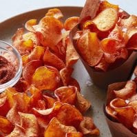 Once the chips are crisp, remove them from the hot oil using a slotted spoon and transfer them onto a paper towel lined baking sheet. While the chips are still wet with oil, dust them with the homemade BBQ seasoning mixture.