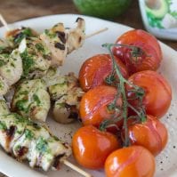 Heat an indoor or outdoor grill over medium high heat. Remove the chicken from the marinade, shaking off any excess, and thread the pieces of chicken onto the skewers.