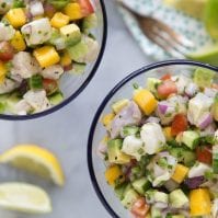 In a clean bowl, toss together the mango, cucumber, avocado, red onion, tomato, jalapeño and more chives. Add the sea bass and toss to combine. Taste and season with additional salt, pepper or lime juice as needed. Serve immediately.