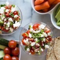 Add the chopped cucumbers on top of the tzatziki, followed by the tomatoes and then the feta cheese.