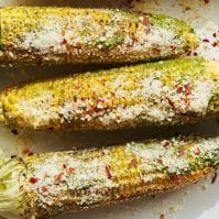 Using a pastry brush, brush some of the basil vinaigrette onto the corn and then heavily sprinkle with parmesan cheese and seasonings. Serve immediately.