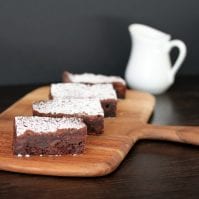 Run a knife around the edges if not using a silicone mold, and invert the brownie onto a cutting board. Cut into 12 rectangles. Dust the tops with powdered sugar just before serving.