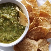 Remove from the oven and cool. Transfer the tomatillos into a blender or food processor with the onion, jalapeño, garlic, cilantro, lime juice and salt. Blend until smooth. Taste and adjust seasoning with more cilantro, lime juice, or salt according to preference. Serve with tortilla chips.