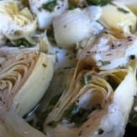 In a medium bowl combine the lemon juice, parsley, garlic, salt, pepper and olive oil. Toss the cut artichoke hearts into the mixture and then place into a baking dish. Bake in a 450 degree oven for 10 minutes and then serve.