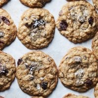 In a large mixer, combine the softened butter and brown sugar with a paddle attachment. Let whisk for 2 minutes. Add the eggs one at a time, followed by the vanilla extract. Add the flour, baking soda, sea salt and baking powder and slowly combine, making sure not to overmix the batter. Add the oats, chocolate chips and chocolate discs and cherries and combine. Refrigerate batter for 1 hour.