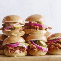After 8 hours, using 2 forks, shred the pork and remove the pork with the remaining sauce into a large bowl. Toast the slider buns and add some of the pulled pork to each bun. Top with some pickles are serve as needed.