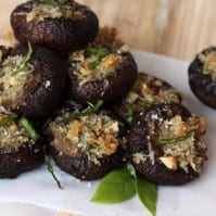 Pre-heat your oven to 350 degrees. Clean the mushrooms and remove the stem. Place them bottom side up on a parchment lined baking dish. In a small bowl, combine the rest of the ingredients and season with salt and pepper. Drizzle olive oil over all of the mushrooms. Then fill the mushroom cavity with a scoop of the filling. Top the mushrooms with another drizzle of olive oil and let them bake in the oven for about 25 minutes.Once removed from the oven you can add more herbs or cheese on top and adjust the seasoning as needed.