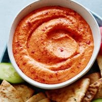 Add the roasted red peppers, artichoke hearts, tahini, garlic, red pepper flakes, smoked paprika, lemon juice and salt and blend until smooth. With the machine running, drizzle in 1 tablespoon of water at a time, until you get very smooth, light and creamy mixture.