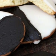 To make the chocolate toppings: Add melted chocolate to remaining white icing and whisk until smooth. If its too thick, add another tbsp of corn syrup to thin. Ice the other 1/2 of the cookie and let the icing set again before eating.
