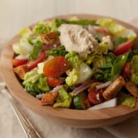 Combine the dressing with the salad and gently combine until lightly dressed. Divide and serve with a dollop of hummus and more freshly cracked pepper if needed.