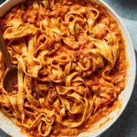 Once cooked, stir in the Béchamel sauce into the meat sauce and combine with a wooden spoon until fully combined. Add the cooked fresh pasta and stir to combine.