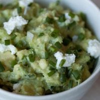 Combine all ingredients in a large bowl, except the goat cheese, and mash with a fork until half smooth and half chunky. Toss the goat cheese in at the end and serve.