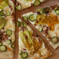 Add 1 cup of cheese to each pizza and then evenly scatter the pancetta and zucchini mixture on top of the cheese. Lay the squash blossoms on top.