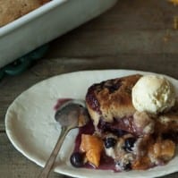 Transfer sliced peaches to a baking dish, about 9x9 inches