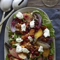 Remove and let cool slightly, carefully rub the skin off the beets. In a large salad bowl or serving platter, arrange the roasted squash, arugula, beets, walnuts, goat cheese.