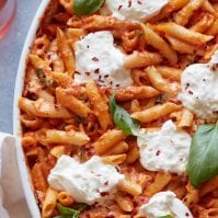 Transfer the pasta into a large baking dish. Dot with the butter and bake until bubbly and brown on top, about 10-15 minutes. Once you take it out of the oven, top it with the burrata cheese if you're using. Let sit for 10 minutes before serving.