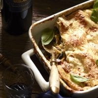 Grease a large 8x12 inch pan. Pour 1/2 cup of the bechamel sauce evenly on the bottom of the pan. Lay down one layer of no-boil pasta sheets. Place teaspoon sized dollops of ricotta on top of the pasta. Spread out the 1/2 of the mushroom mixture, drizzle 1/2 cup of bechamel, sprinkle 1/4 cup of Parmesan, and 4 ounces of the fresh mozzarella. Repeat, so you have 2 layers. Top the last layer of pasta with the remaining bechamel, and spread it evenly on top. Add the final 1/4 cup of Parmesan and remaining mozzarella.