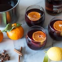 Serve the warmed wine with a round of lemon and a round of orange.