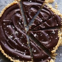 Pour this mixture over the middle of the chocolate tart and use an offset spatula to spread it around in a swoopy motion. Let the entire tart chill in the refrigerator until cold. Dust with flaky sea salt before slicing and serving.