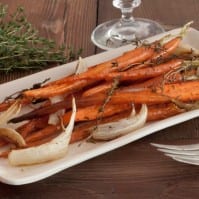 Preheat your oven to 400 degrees F. Add the olive oil to a large skillet over medium high heat. Add the carrots, onion and thyme and toss to coat in the olive oil. Sprinkle with salt and pepper and transfer the skillet, carrots and all into the oven, and roast for 15 minutes until the carrots are fork tender.